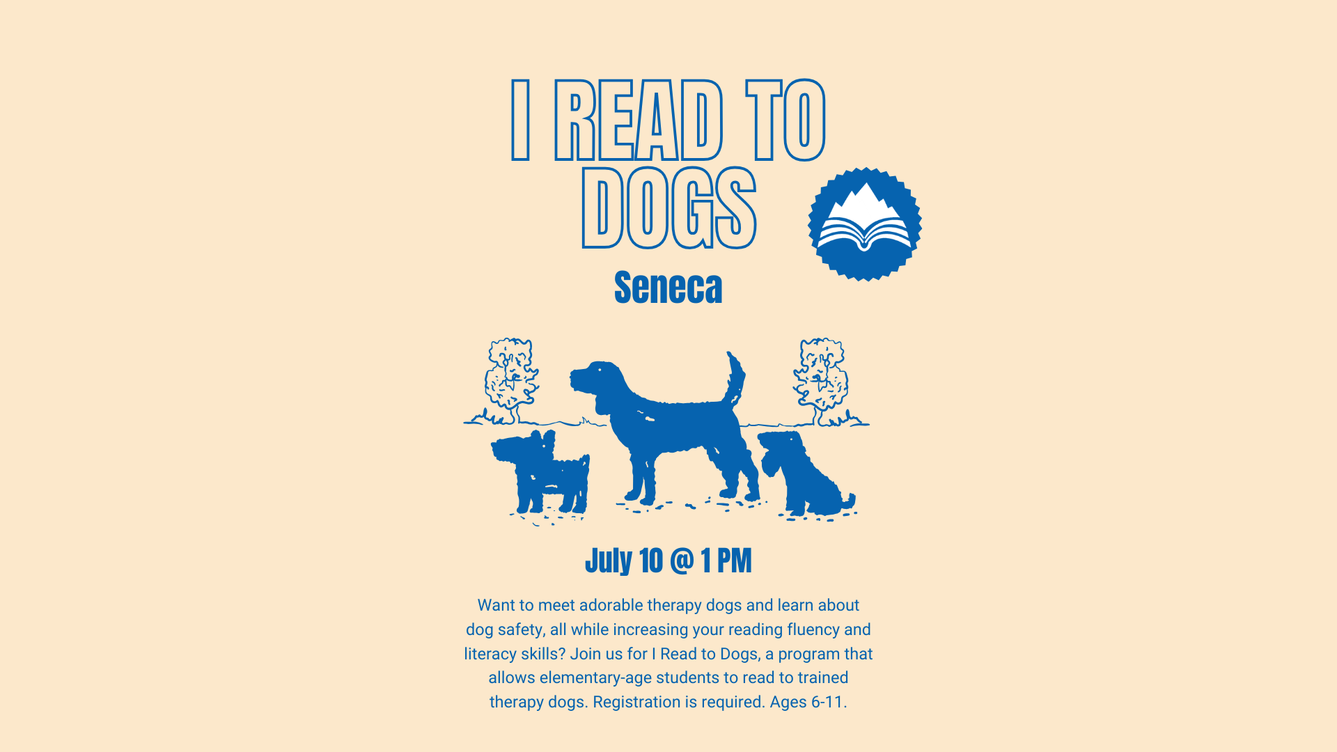 Want to meet adorable therapy dogs and learn about dog safety, all while increasing your reading fluency and literacy skills? Join us for I Read to Dogs, a program that allows elementary-age students to read to trained therapy dogs. Registration is required and will open on May 25. Ages 6-11.