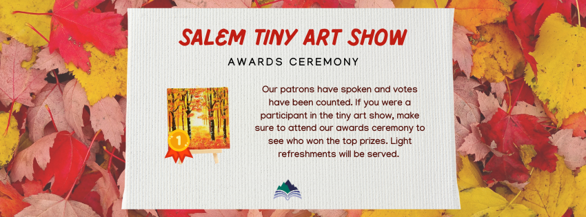 Our patrons have spoken and votes have been counted. If you were a participant in the tiny art show, make sure to attend our awards ceremony to see who won the top prizes. Light refreshments will be served.