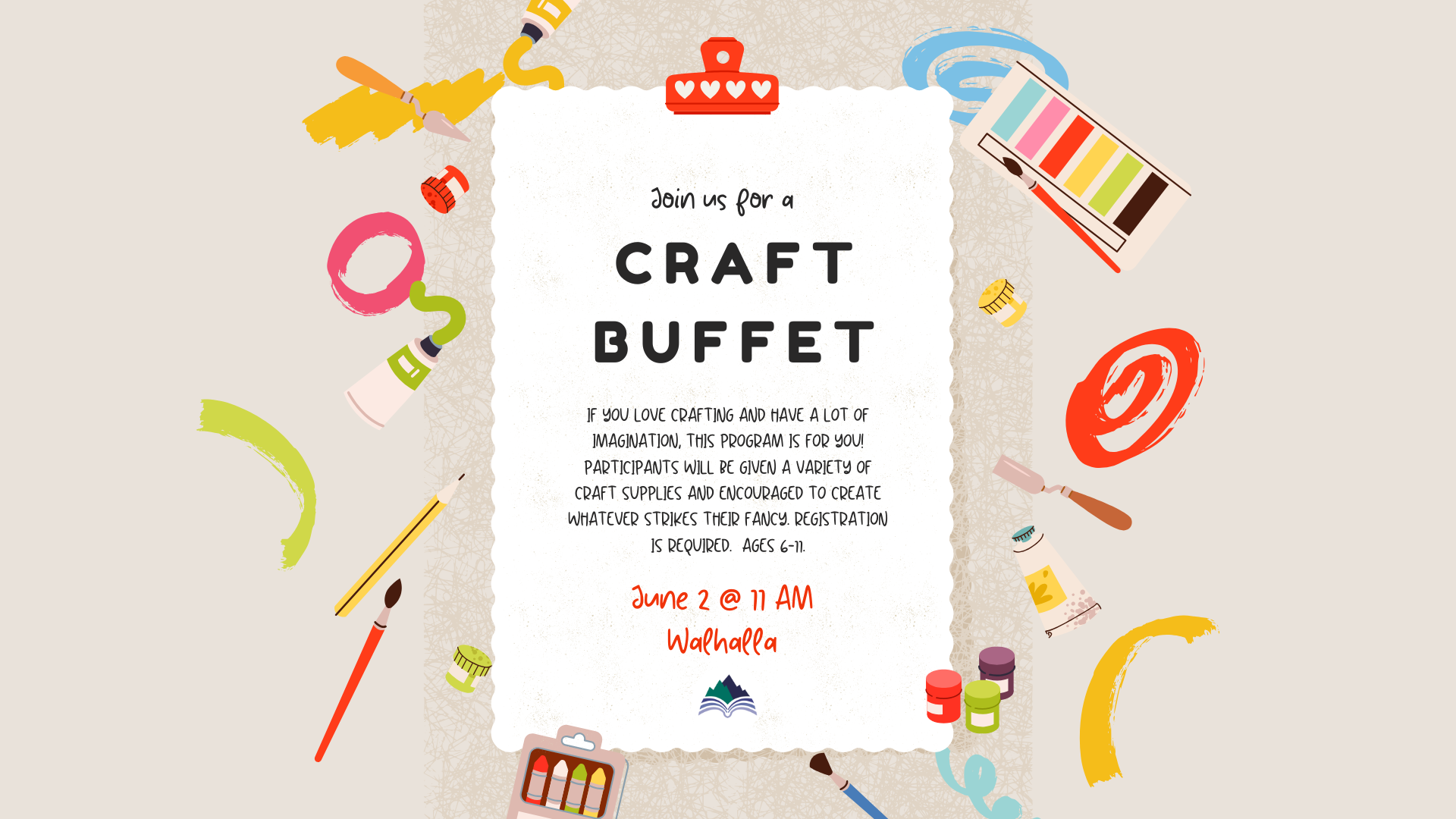 If you love crafting and have a lot of imagination, this program is for you! Participants will be given a variety of craft supplies and encouraged to come up with whatever creative craft they can think of. Registration is required. Ages 6-11.