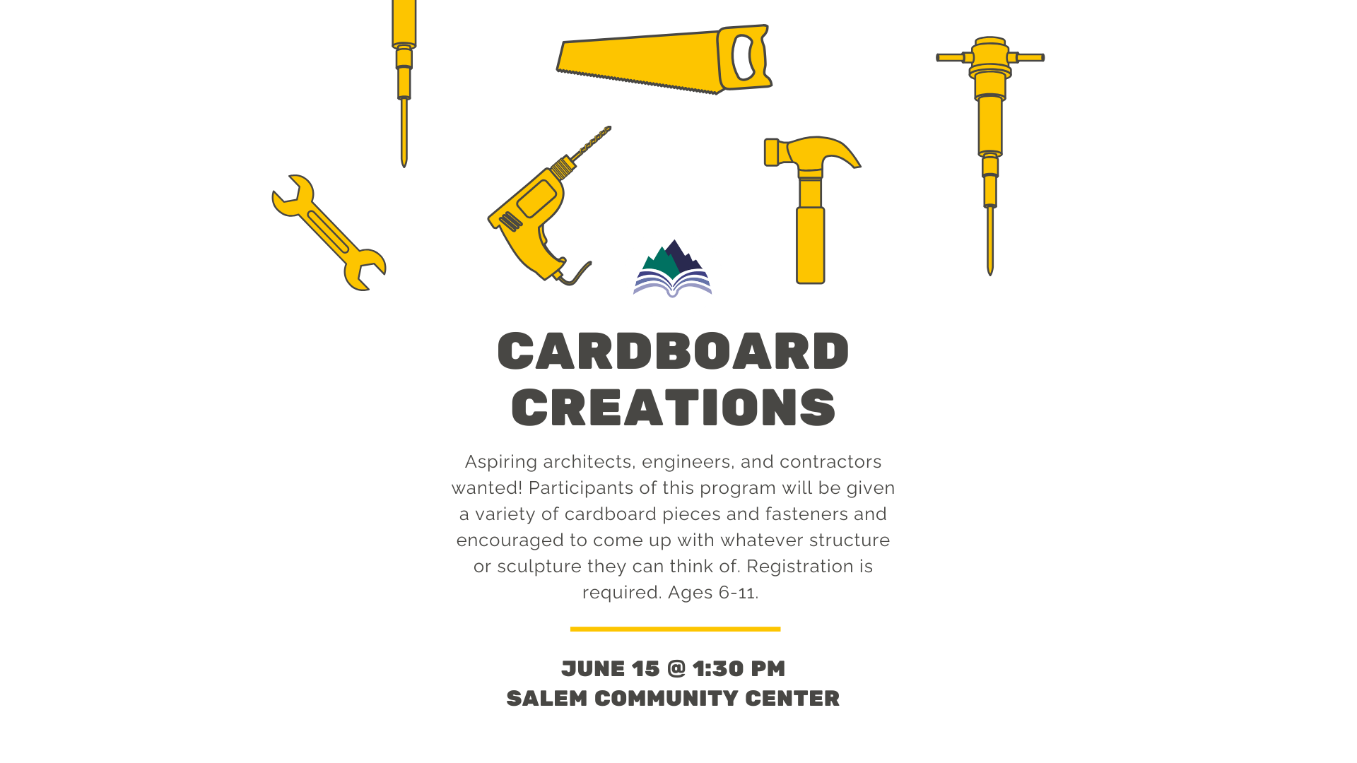 Salem Community Room 5 Park Avenue, #A, Salem, SC, United StatesSalem Library EventsAspiring architects, engineers, and contractors wanted! Participants of this program will be given a variety of cardboard pieces and fasteners and encouraged to come up with whatever structure or sculpture they can think of. Registration is required. Ages 6-11.