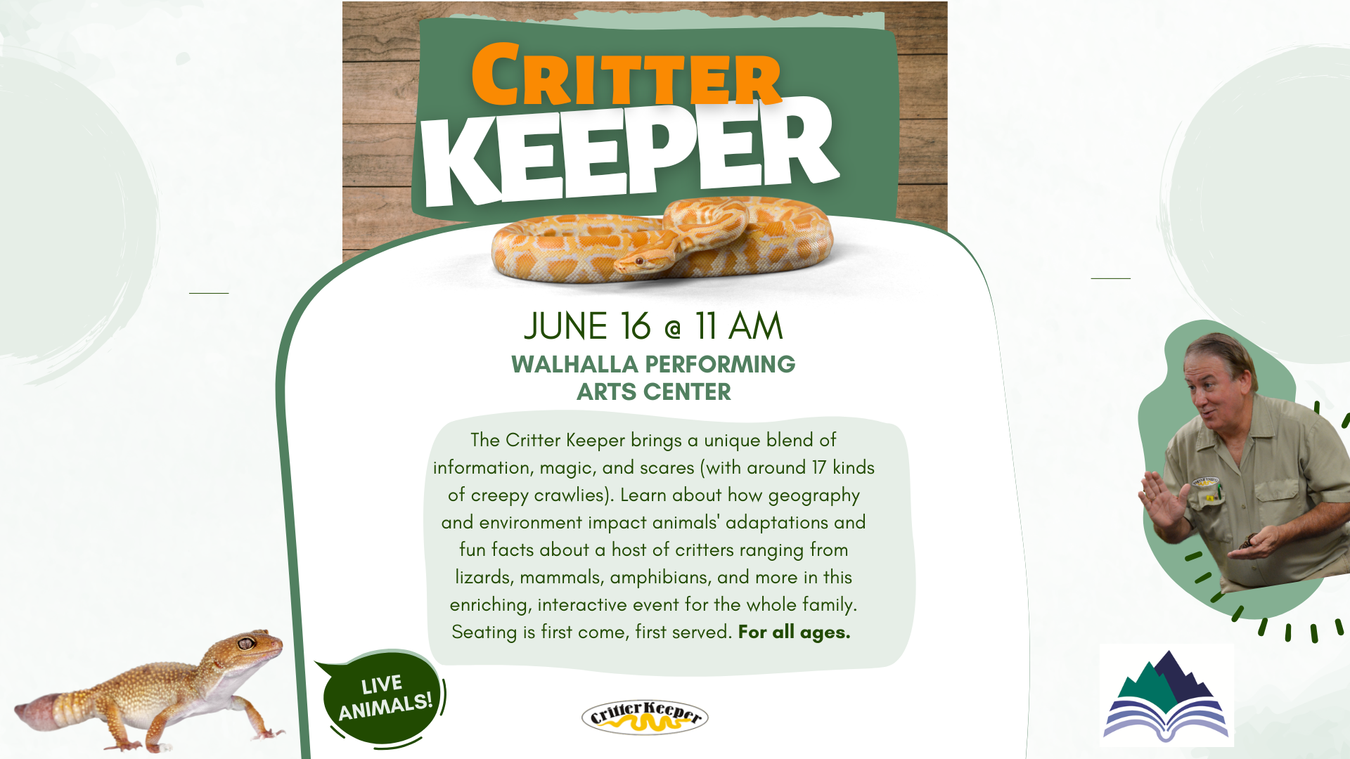 Walhalla Performing Art Center 101 E North Broad St, Walhalla, SC, United StatesOther VenuesThe Critter Keeper brings a unique blend of information, magic, and scares (with around 17 kinds of creepy-crawlies). Learn about how geography and environment impact animals' adaptations and fun facts about a host of critters ranging from lizards, mammals, amphibians, and more in this enriching, interactive event for the whole family. Seating is first-come, first-served. All ages.