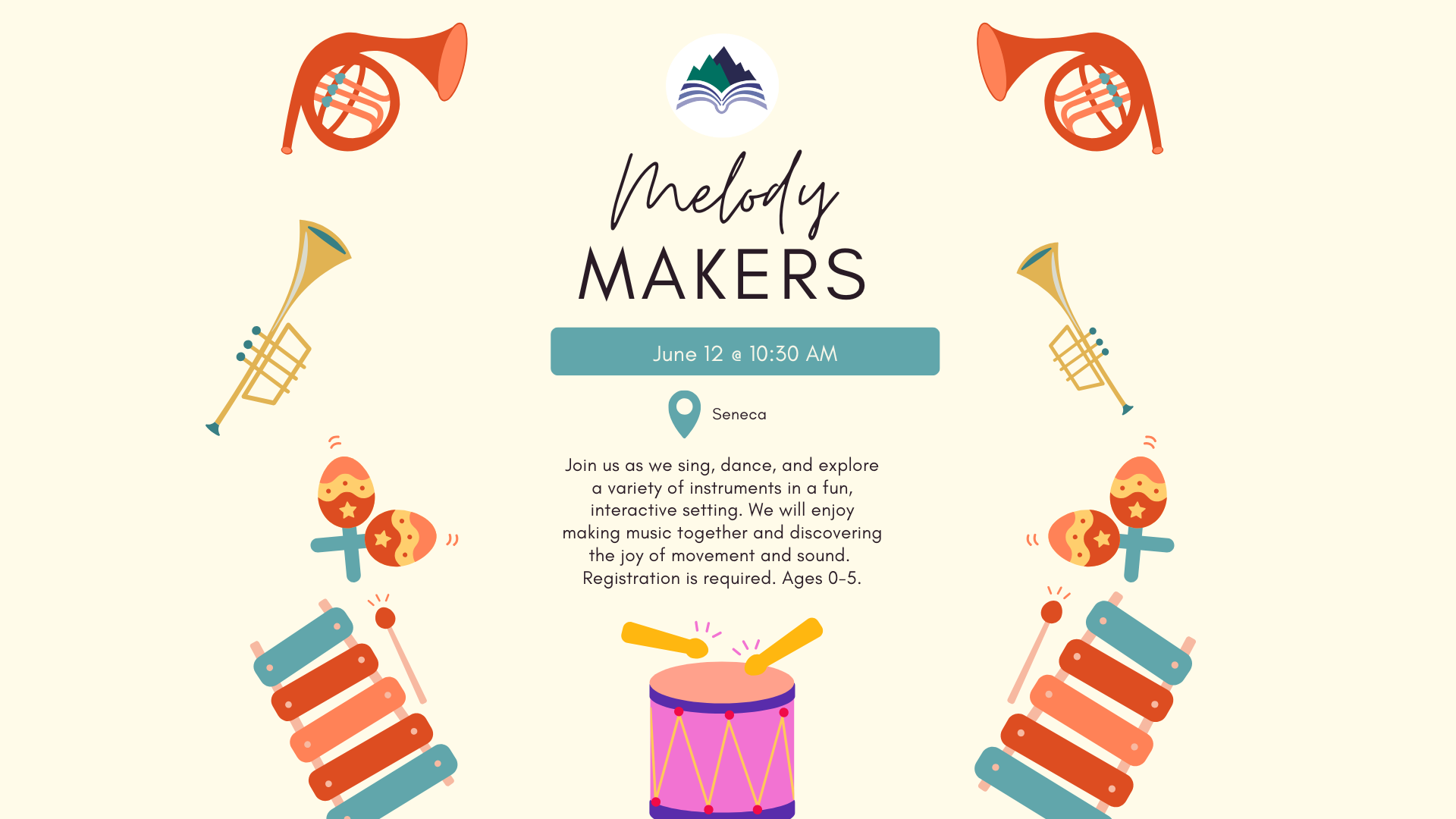 Seneca Library 300 East South 2nd Street, Seneca, SC, United StatesSeneca Library EventsLittle ones will sing, dance, and explore a variety of instruments in a fun, interactive setting. This program encourages creativity and imagination while introducing children to the world of rhythm, sound, and musical play! Caregivers and kids will enjoy making music together and discovering the joy of movement and sound. Registration is required. Ages 0-5.
