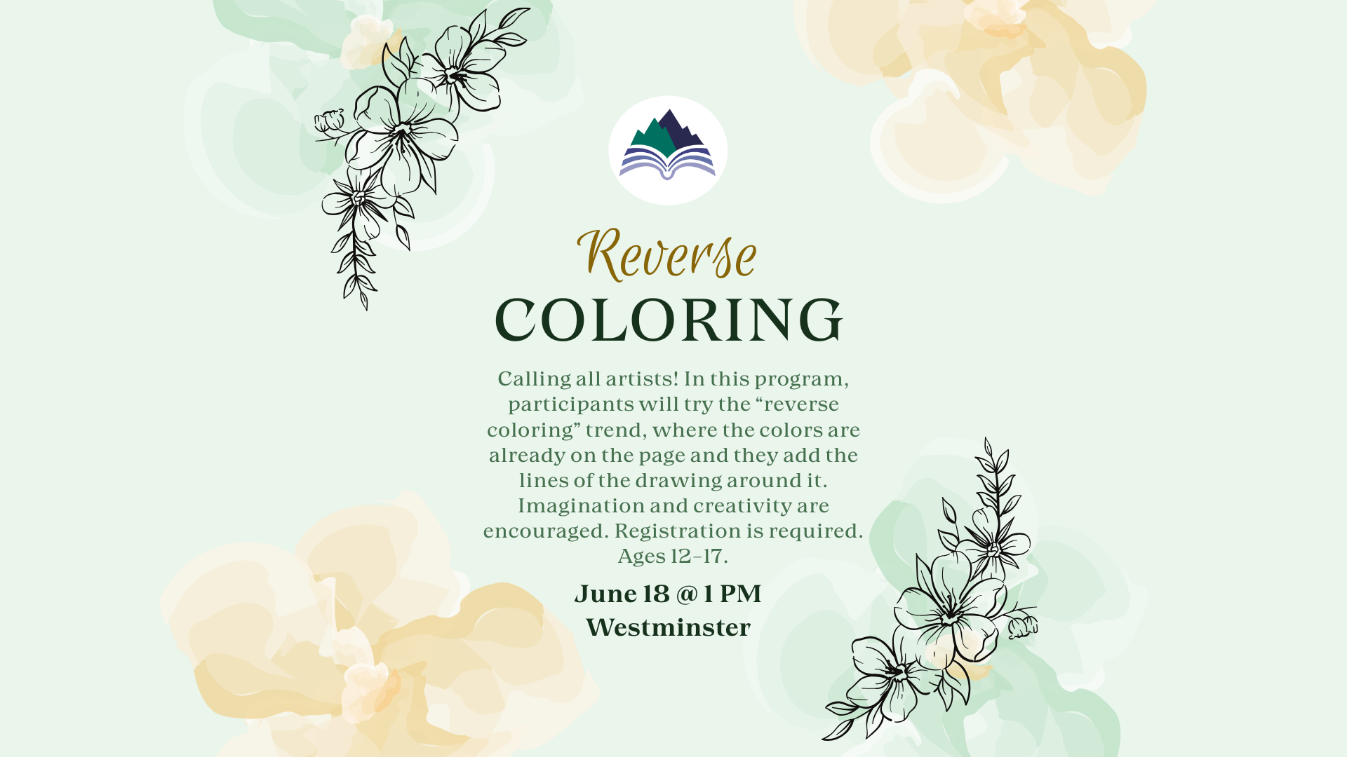 Westminster Library 112 West North Avenue, Westminster, SC, United StatesWestminster Library EventsCalling all artists! In this program, participants will try the “reverse coloring” trend, where the colors are already on the page and they add the lines of the drawing around it. Imagination and creativity are encouraged. Registration is required. Ages 12-17.