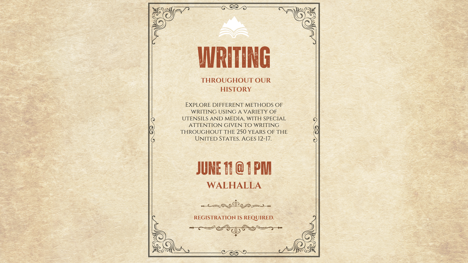 Walhalla Library 501 West South Broad Street, Walhalla, SC, United StatesWalhalla Library EventsExplore different methods of writing using a variety of utensils and media, with special attention given to writing throughout the 250 years of the United States. Registration is required. Ages 12-17.