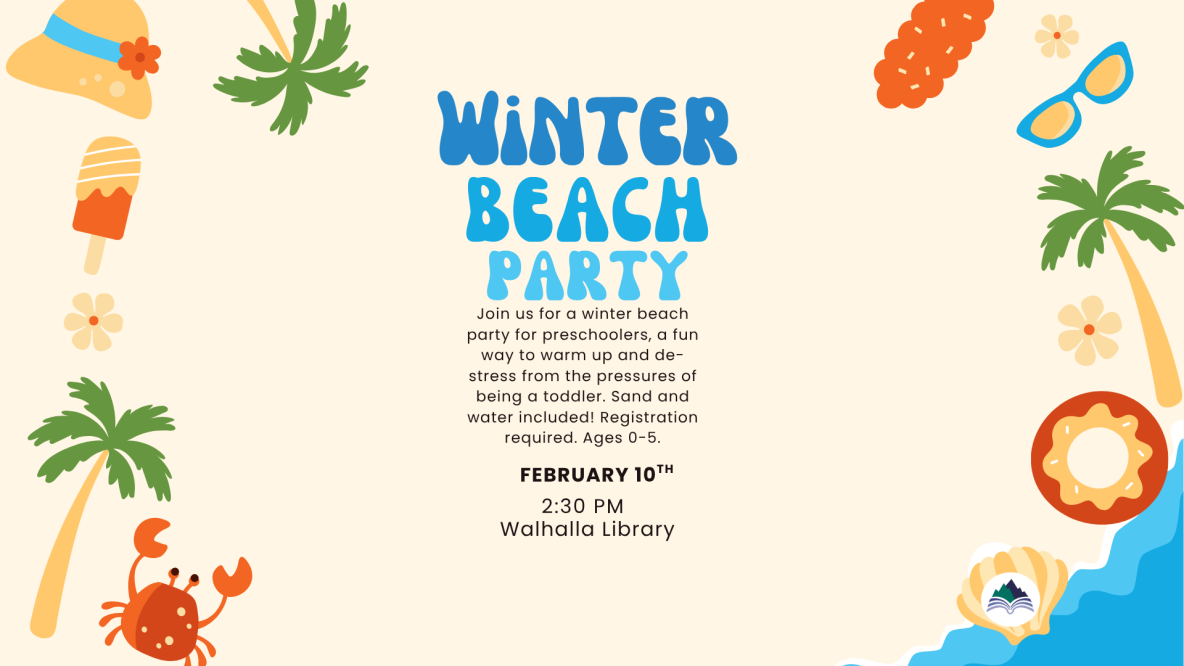 Join us for a winter beach party for preschoolers, a fun way to warm up and de-stress from the pressures of being a toddler. Sand and water included! Registration required. Ages 0-5.