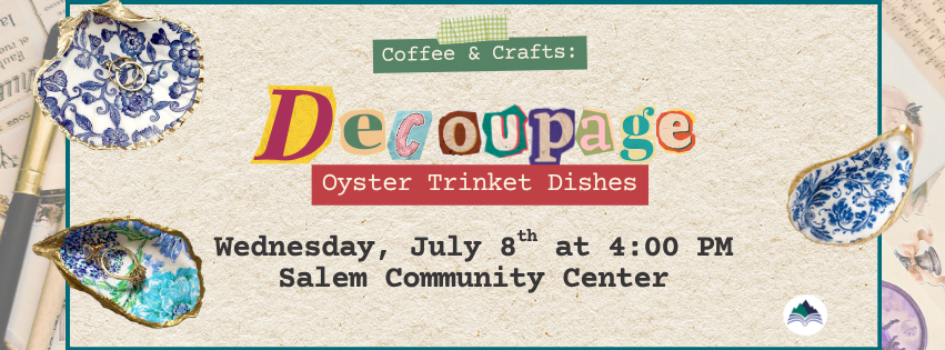Need a new trinket dish? You’re just in luck! Join us as we decoupage trinket dishes using faux oyster shells, mod podge, embellished napkins, and gold paint. Registration is required and will open on Wednesday, June 17th at 10:00 AM. Ages 14+.