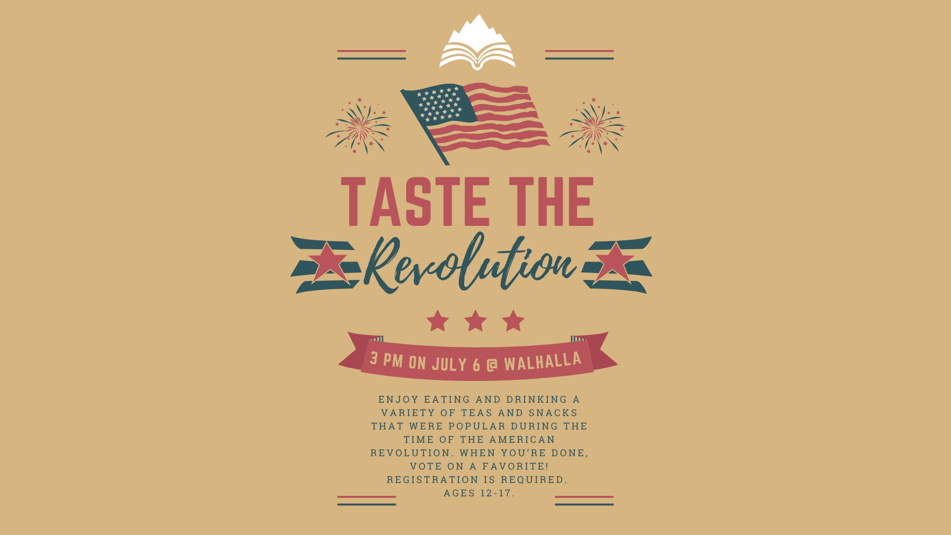 Enjoy drinking and eating a variety of teas and snacks that were popular during the time of the American Revolution. When you’re done, vote on a favorite! Registration is required and will open on May 25. Ages 12-17.