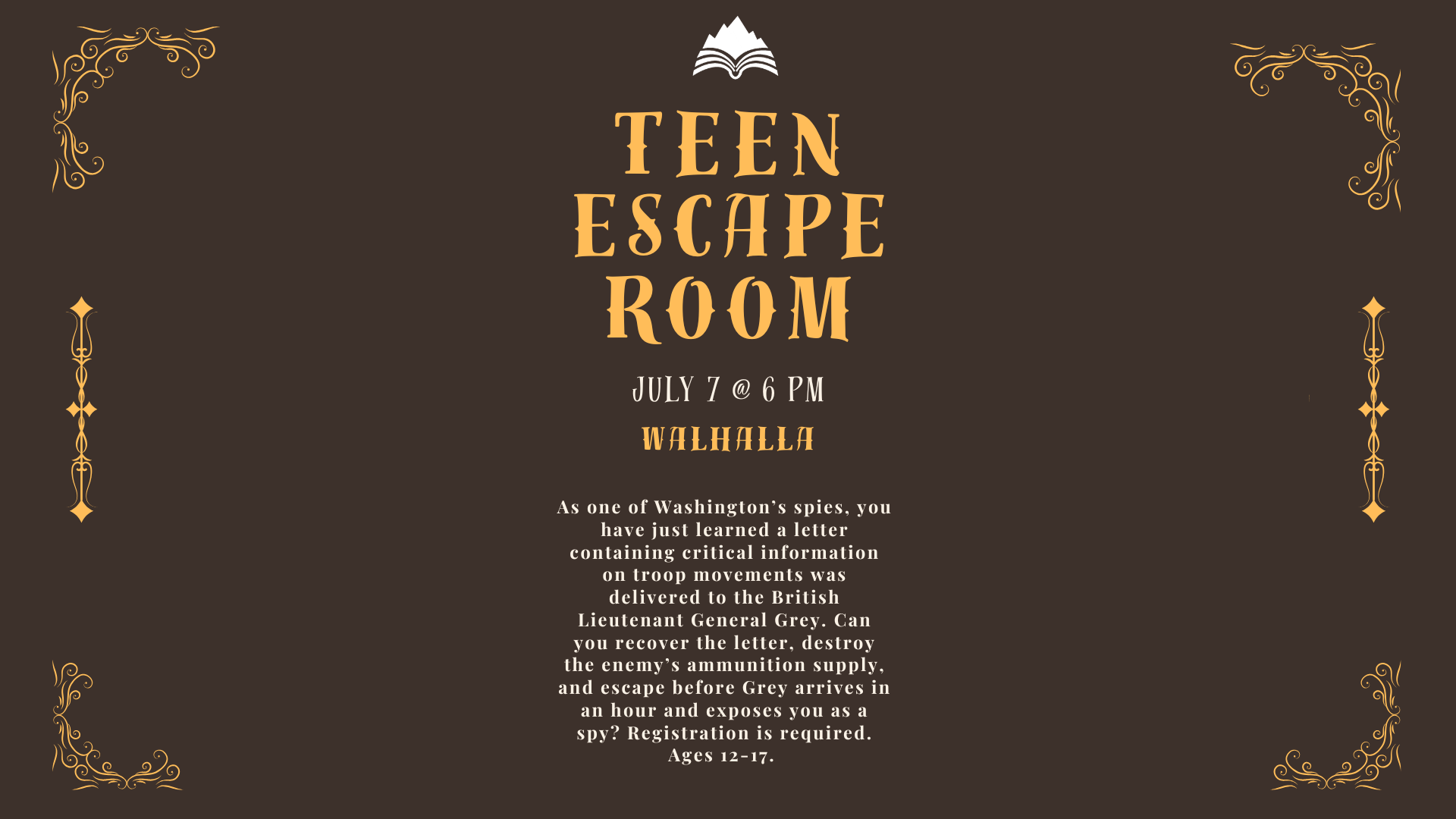 As one of Washington’s spies, you have just learned that a letter containing critical information on troop movements was delivered to the British Lieutenant General Grey. Can you recover the letter, destroy the enemy’s ammunition supply, and escape before dawn arrives in an hour and exposes you as a spy? Registration is required and will open on May 25. Ages 12-17.